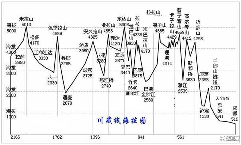 在网上见到一张318国道川藏段的海拔图,不知作者是谁,但画得非常棒。形象展示出318的特点——高低落差巨大,在四五千米与两三千米之间,反复上下,犹如驼峰。可见,高山与峡谷是这一段318的主旋律,其中,比较高的山,共有14座。