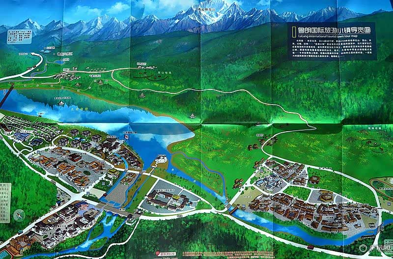 下图白色粗线是318国道,左上角是波密方向,右下角是林芝、拉萨方向。从波密过来,刚进入鲁朗时,有座扎西岗村(图中左上),那一带是牧场。牧场下方那个湖,叫扎塘鲁错,再往下是旅游小镇,高级酒店都在这里。旅游小镇的右边,是鲁朗镇,普通旅馆和餐馆在这一带。