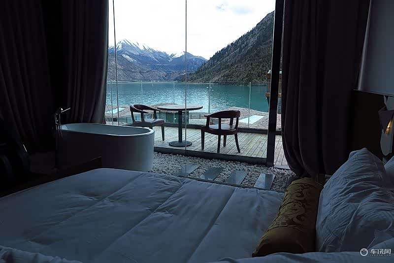 店家以为我来住宿,便推荐他们刚建的一家更棒的。好奇地跑去看。天哪,真是没话说,硬件一流,环境极佳。当然,房费也不便宜,这样的一个景观房,淡季每晚1400元,自6月起进入旺季,上浮至少200元。当然,如果想少花点儿钱,可以选择普通标间。还嫌贵的话,干脆在露营区搭帐篷——这家酒店的名字就叫自驾房车露营基地。