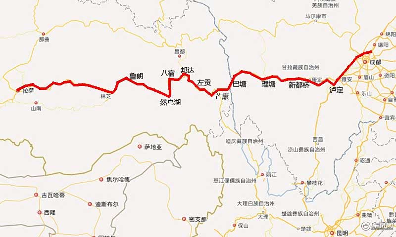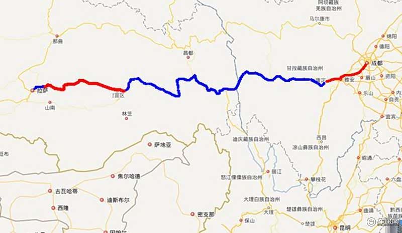 与青藏线的平淡相比,川藏南线的景色非常棒。在2000公里路途中,600公里高速(下图红线),1400公里国道(下图蓝线)。而在这1400公里国道中,只有40公里处于施工状态,其余均为不错的柏油路。