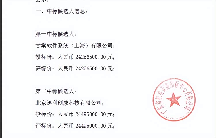 第一中标候选人为甘棠软件系统(上海)有限公司,投标价为2425.65万元;
