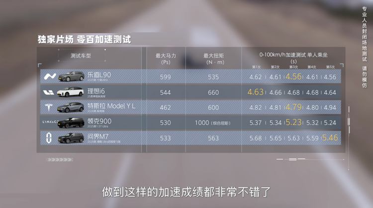 测试结果颠覆预期:全场唯一7座车型乐道L90以4.56秒拿下全场第一,加速响应零延迟,完全不像大车;理想i6以4.63秒紧随其后,展现中国品牌纯电车型实力;特斯拉Model Y L以4.79秒排第三,轴距加长未过多影响加速,但不支持弹射起步;领克900的5次成绩均超5秒,以5.23秒排第四;问界M7以5.46秒垫底。