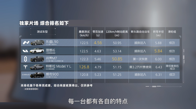 小结:5台车型均能满足日常安全需求,但中国品牌两极分化明显。乐道L90、理想i6可叫板合资标杆,问界M7、领克900则暴露ESP标定、车身轻量化的短板,中国品牌仍需在核心技术调校上深耕。