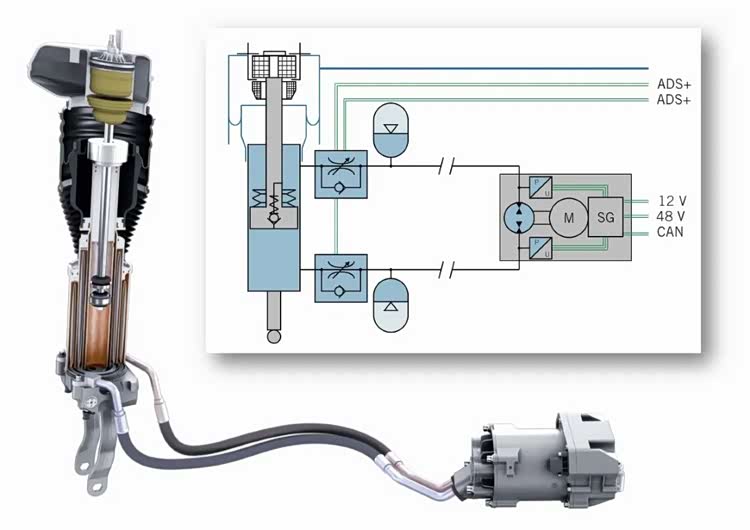 2019年,第三代升级为智能魔术车身控制E-ABC,正式“触电”,每个车轮上都装一个电动液压泵。这种悬架叫“电液悬架”,液压系统不再靠发动机驱动,改成电机驱动,一轮一个电机,响应更快、力道更足。