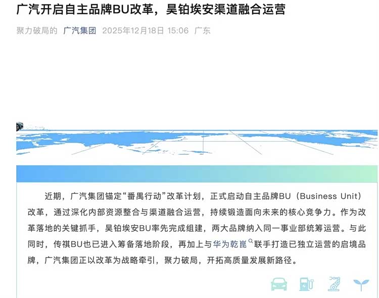 【文/财圈社&道哥说车 麻建宇】12月18日,广汽集团官方公众号消息称,将正式启动自主品牌BU改革,昊铂埃安BU率先完成组建,两大品牌纳入同一事业部统筹运营,并将在2026年3月底前完成渠道全面融合。