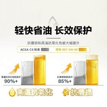 粘度等级为5W-30的博世007机油,相较ACEA C3标准,高温抗氧化性能提升90%+,抗磨损性能提升85%+,满足奔驰MB 229.31/229.51、宝马BMW LL-04认证。