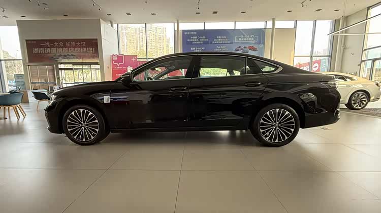 车身侧面的线条流畅而富有张力,从车头延伸至车尾的腰线一气呵成,勾勒出修长优雅的车身轮廓。长轴距带来的宽敞车内空间,在侧面造型上也得到了充分体现,车身比例协调匀称,尽显中高级轿车的质感。车窗边缘的镀铬饰条从 A 柱一直延伸至 C 柱,提升了整车的精致度,车门把手采用与车身同色设计,搭配隐藏式的钥匙孔,让侧面造型更显简洁大方。