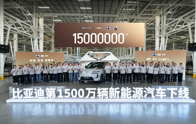 车家号·0浏览·2025-12-19 10:53 · 北京12月18日,比亚迪第1500万辆新能源汽车下线仪式在济南工厂举行, 腾势N8L(参数|询价)成为第1500万辆下线车型,这也是腾势N8L的第15000辆下线。这距离比亚迪的第1400万辆新能源车下线仅两月。据介绍,比亚迪达成1500万辆新能源车下线用了整整17年,而从1000万辆到1500万辆,比亚迪却仅用了13个月。