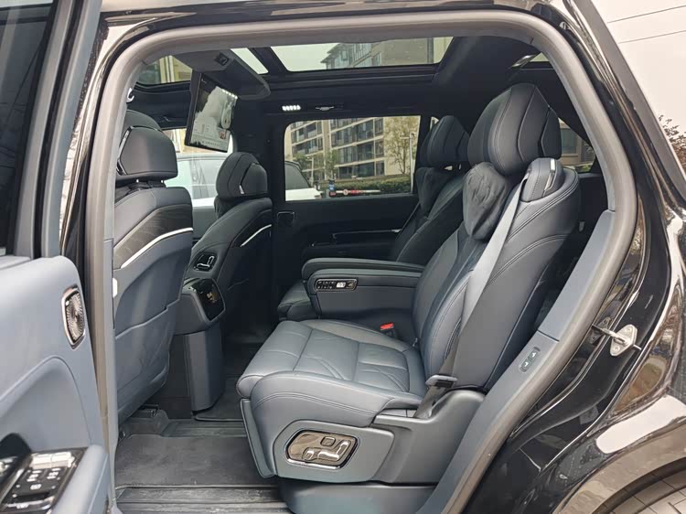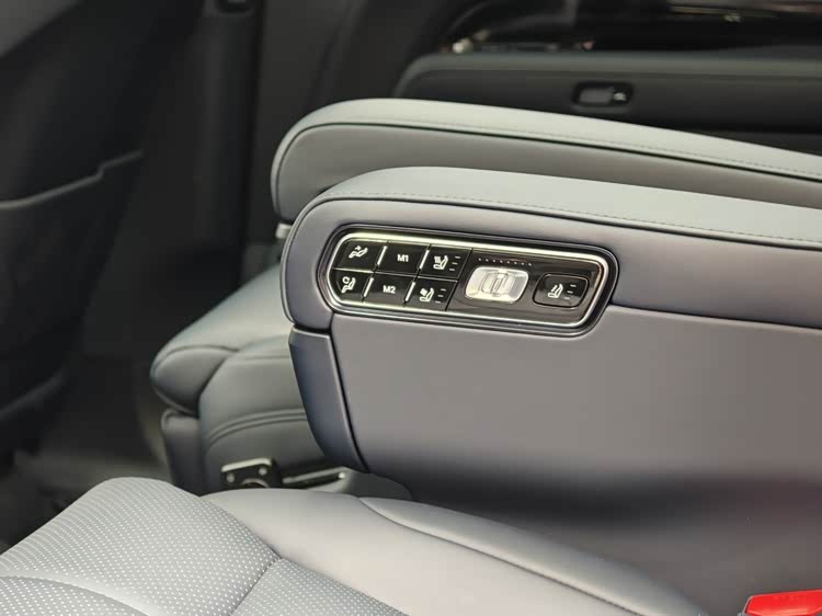 极氪9X的内饰则更显“奢华”,大量的水晶切割按键、悬浮式大屏、分区氛围灯与暗色音响罩的组合,把“奢华感”很外露的表现出来。前排门把上布置了复杂的实体按键,操作逻辑稍显复杂。细节上有些点很有意思,包括中央操纵台两侧使用的是实木,而不是大家常用的皮革包裹。另外试驾车采用的是单块中控屏幕,而没有选装副驾屏,这其实显得副驾IP台更垂直、更符合硬派的特征。