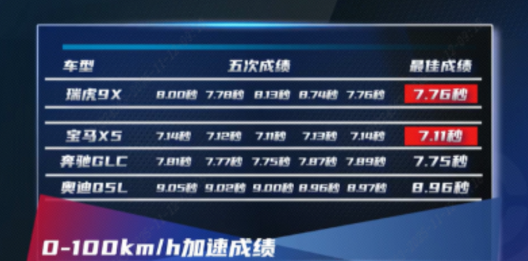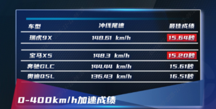 在直线加速项目中,瑞虎9X展现了新一代动力系统的成熟度。鲲鹏2.0T引擎不仅在起步加速阶段迅速建立爆发力,在0-400米全程中更凭借148.61 km/h 的尾速领先全部德系对手。这项测试比0-100更能体现发动机中后段持续能力,也显示出自研动力总成的整体效率。曾经被认为是德系优势的动力表现,如今正被中国新燃油力量逐步重构标准。