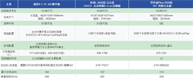 在目前的汽车市场,如果想买一辆15万左右的SUV燃油车, 瑞虎9(参数|询价)耀享版、途观L 2025款出众款和昂科威 2025款都是绕不开的选择。这三款车型在空间、配置和安全方面都有着均衡的表现,也是细分市场内的标杆车型。那么,如果把这三款车型放在一起比较,十五万左右油车推荐哪款好?哪款才是15万最建议买的燃油车?接下来就跟着本文一起来找出答案吧。