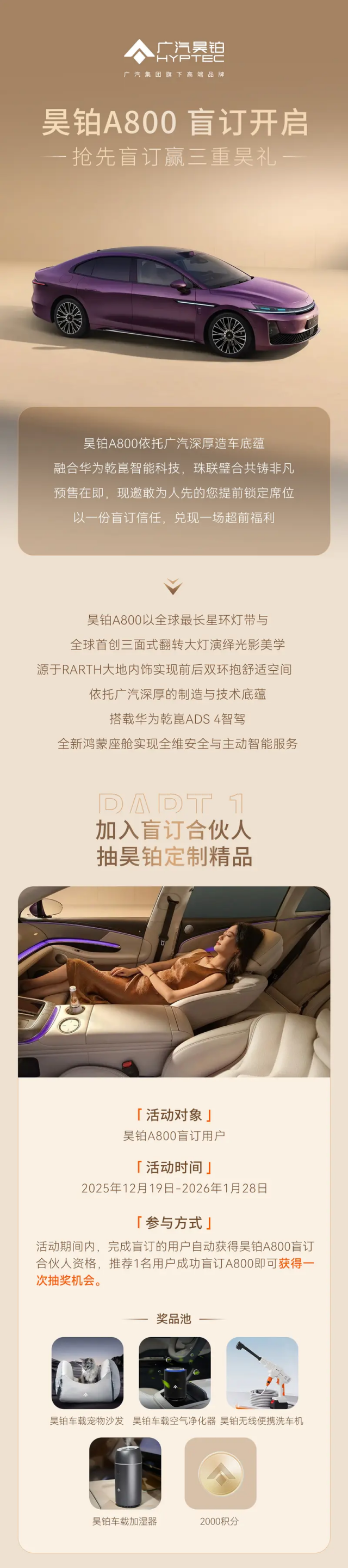 从昊铂官图看,2025 年 12 月 19 日 - 2026 年 1 月 28 日,通过官方渠道支付 88 元可抵 2000 元意向金,支付 888 元可享优先提车 + 价值 8888 元限量 7 孔蝶式轮毂;盲订用户自动成为 “合伙人”,推荐 1 人成功盲订可抽奖(奖品含车载宠物沙发、空气净化器等)。