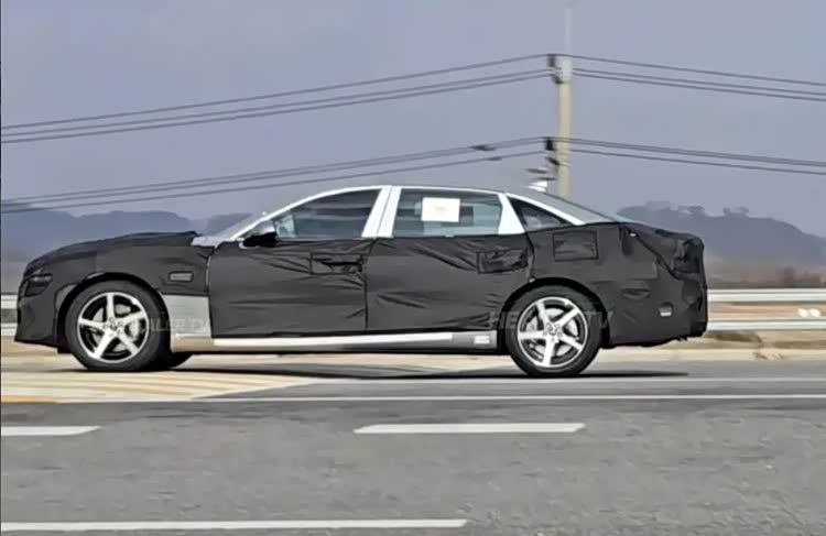 车身侧面最值得关注的是长轴距版本,后门区域明显加长,配合溜背式车顶线条,看上去既维持优雅姿态又拓展后排空间。车尾部分,分段式尾灯组预计延续现款设计,通过熏黑处理强化运动气质,隐藏式排气布局则契合混动车型的静谧属性。据悉,长轴距混动版车型将配备与捷尼赛思G90相同的电动后车门配置。