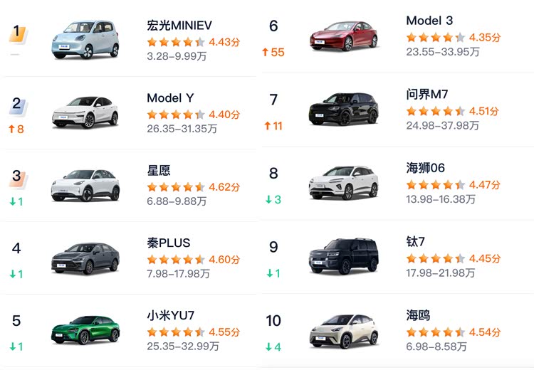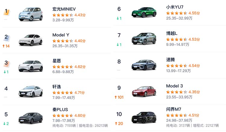 另一个方面,10以下价位产品同样占据4个席位,排名第1的宏光MINIEV销量超过5.6万,排名第10的比亚迪海鸥销量超过2.1万。(秦PLUS由汽车之家统计的经销商报价为6.98万-11.98万,主销车型绝大多数成交价在10万以下,因此也归于10万以下市场)