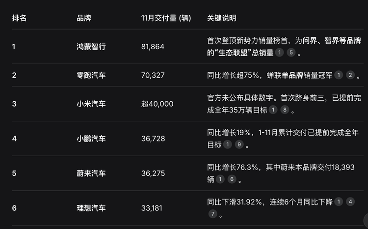 它们在车型榜上没有任何一款产品进入前10,当下最有希望的理想i6要看产能跟进的效率。同时它们在厂商排名榜上也低于小米和鸿蒙智行。