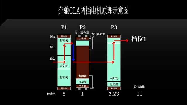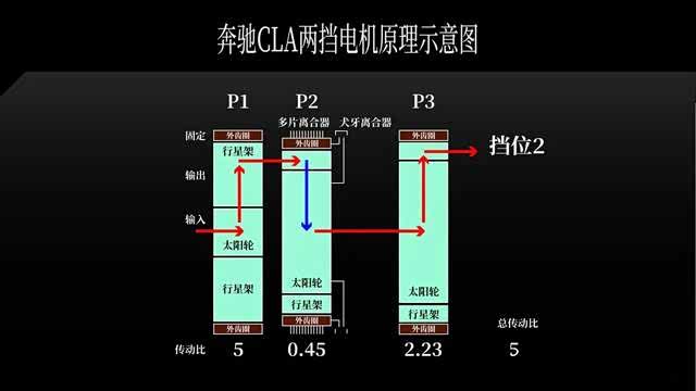 此时,P2 发挥减速作用,动力从行星架输入,太阳轮输出。