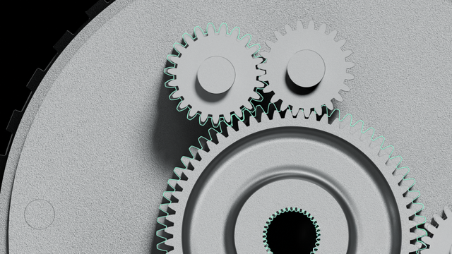 P1 的太阳轮是电机的输入轴,它带动周围的行星轮旋转,外齿圈固定在壳体上,这时候 P1 的输出轮就是它的行星架。它的作用是为低速段提供较大的整体减速比。