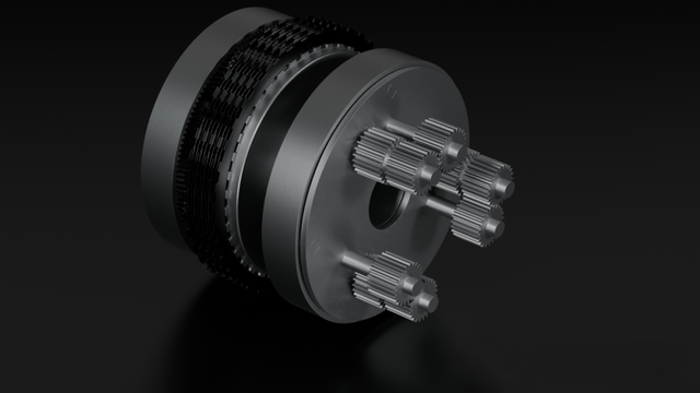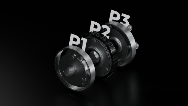 驱动端由三排行星齿轮组成,分别记为 P1、P2、P3,承担不同的机械任务:
