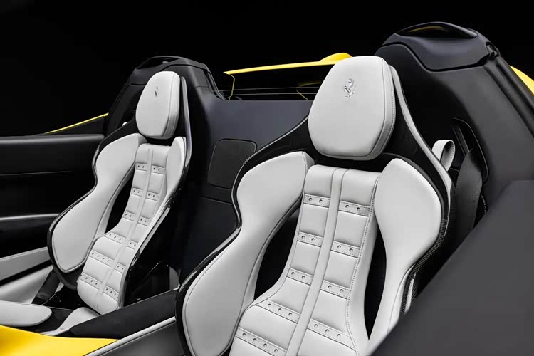 座舱采用环绕式设计。搭载水平仪表盘,配备标志性的发动机启动按钮等实体按键。中央帆形面板整合了换挡机构与手机无线充电。车机提供包括自适应巡航、自动紧急制动系统以及车道保持辅助等功能。配备MyFerrari Connect,车主可通过专属应用远程监控车辆状态。值得一提的是,挡风系统获得专利,在敞篷开启状态下,可将侧窗上方的气流引导至座椅下方的地板区域,减少了座舱上部及中控区域的紊流。