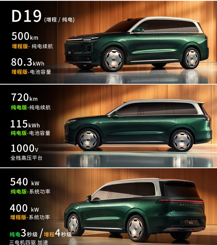 动力方面,零跑D19提供增程版和纯电版两种动力;其中,增程版将采用800V高压增程系统、增程CTC技术及智能增程四驱,三电机四驱车型系统综合功率为400千瓦,0-100公里/小时加速时间为4秒级,匹配80.3千瓦时宁德时代电池,官方公布其纯电续航里程超过500公里。
