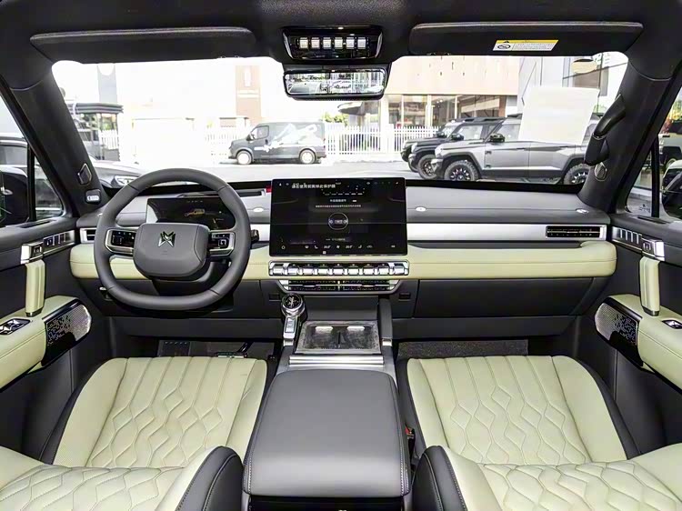 坐进车内,第一感觉是“反差萌”——外观那么硬核,内饰却藏着不少细腻心思。座舱采用横平竖直的对称布局,金属质感按键搭配大面积软包材质,既有机甲风的硬朗,又不失豪华感。Nappa真皮座椅触感细腻,前排座椅还配备了按摩、加热、通风功能,通风采用吸风结构,体感更温和,对老人和小孩特别友好。