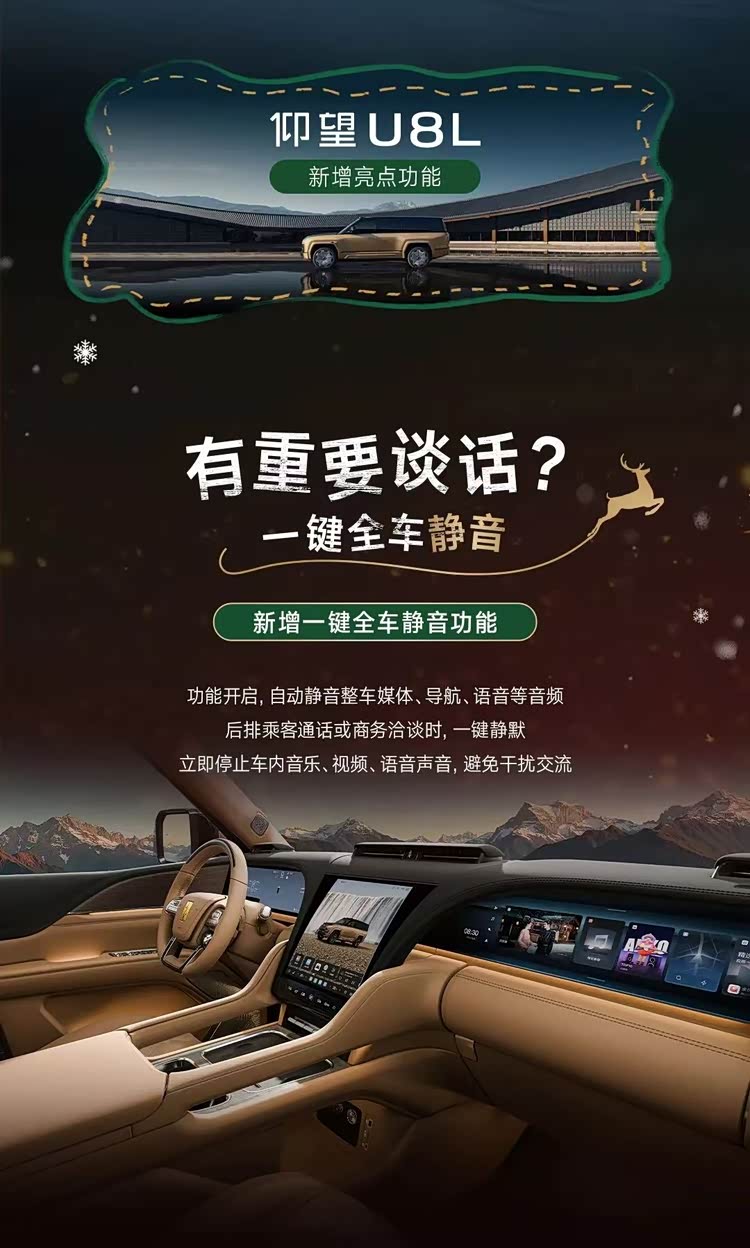近日,仰望汽车为旗下车型仰望U8L鼎世版、仰望U9、仰望U8重磅推送了新一轮OTA升级。此次升级围绕用户真实用车场景,从豪华舒享、个性乐趣到全域智能,通过一系列“暖心”且实用的细节功能新增与优化,让尖端科技更具温度,助力用户在多元出行场景中,尤其是在冬季用车时,拥有更从容、更安心、更愉悦的体验。