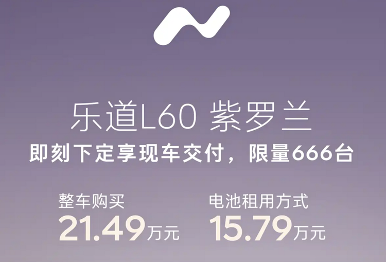 前两天,蔚来ET5和ET5T分别推出了一款远空套装限定版,共计限量555台,现如今,乐道汽车推出了全新乐道L60紫罗兰限定版,同样的是,整车购买的售价为21.49万元,而BaaS电池租用的售价仅15.79万元,且限量666台。