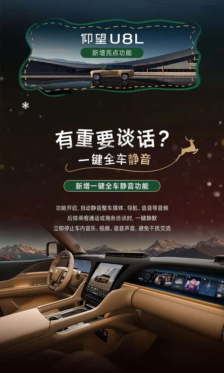 作为仰望的“鼎”级之作,仰望U8L鼎世版的此次升级,首先体贴地考虑到高端商务出行的诸多细节。其中,新增的“一键全车静音”功能,能在后排贵宾交谈时瞬间营造绝对静谧的空间;而强化后的“一键隐私模式”,更可一句语音联动关闭全车车窗、调暗隐私玻璃,迅速构建一个移动的私密会客厅,将尊崇感与安全感融为一体。