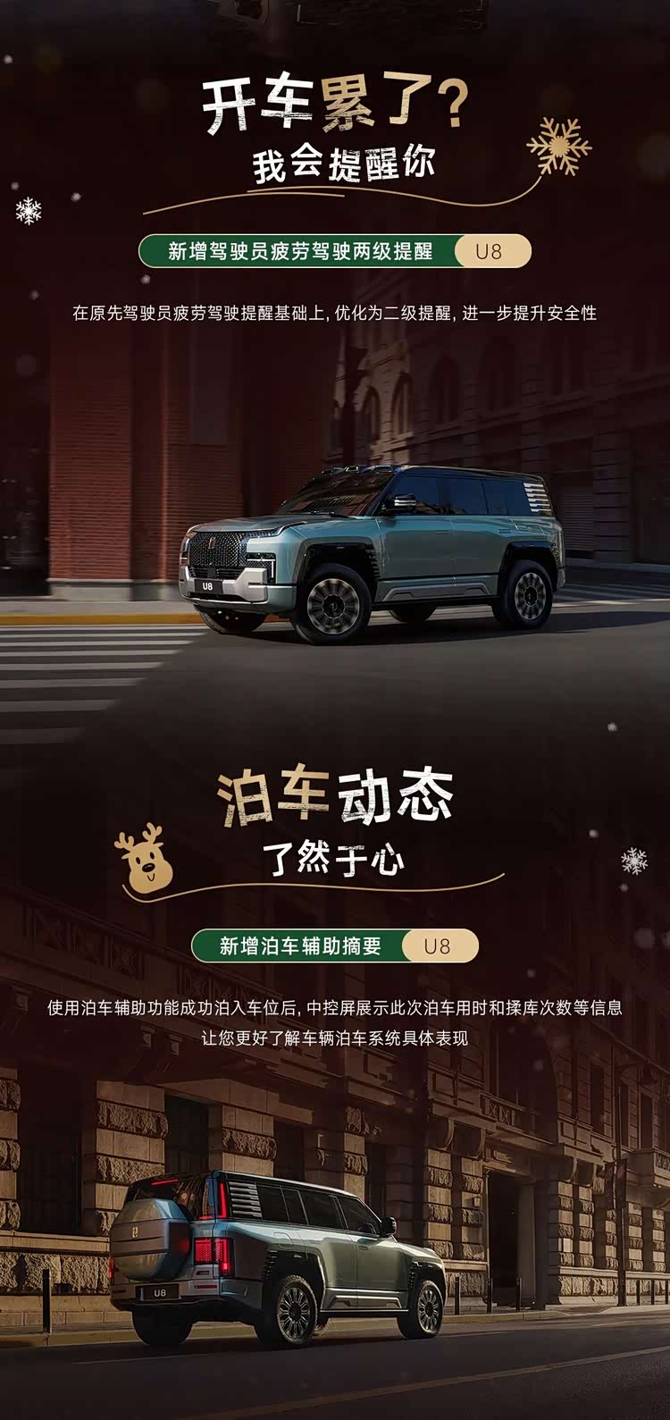 在用户体验的精细优化上,两款车型的升级同样不遗余力。仰望U8的疲劳驾驶提醒升级为更体贴的两级预警,安全关怀更前置;使用智能泊车后,系统还会自动生成并展示泊车时长与揉库次数摘要,让每一次辅助都清晰透明。而两车新增的“一键预约凌晨升级”功能,则完美解决了系统更新与用车时间的冲突,让爱车在深夜闲暇时自主完成进化,次日即享全新体验,真正实现了科技更新的“无感”与“无忧”。