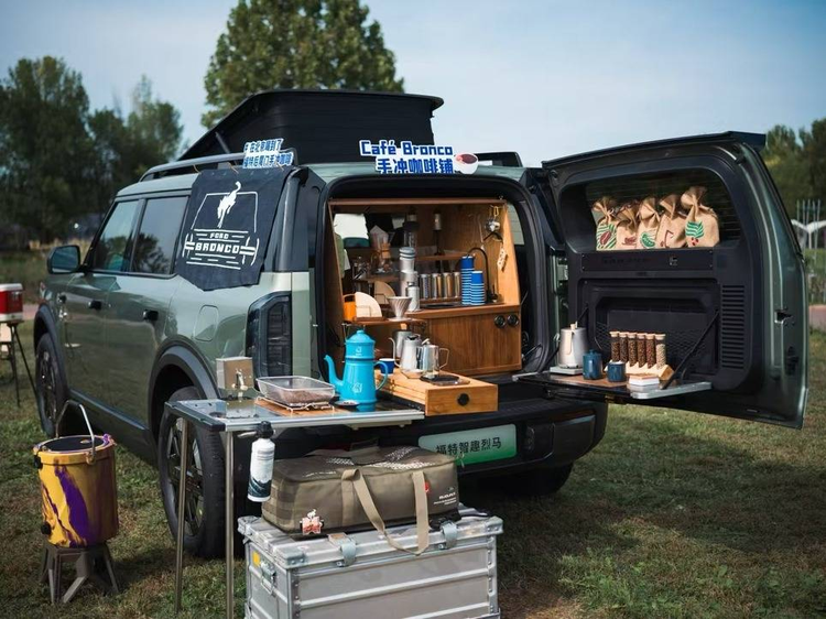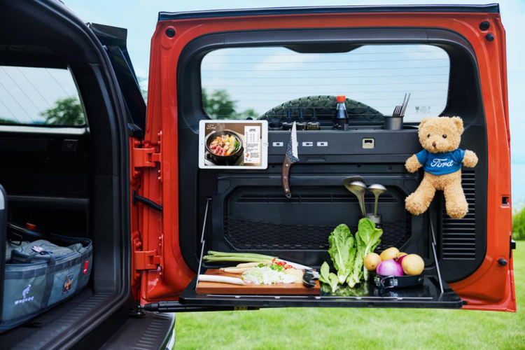 解决完露营睡觉的问题还不够。 福特智趣烈马(参数|询价)的尾门厨房和6.6千瓦对外放电功能,尾门打开就是操作台,切菜、煮火锅、冲咖啡都能搞定。