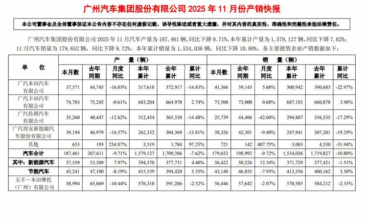 来自广汽集团的销量快报显示,11月广汽埃安销量为3.8万余辆,同比下滑9.4%,今年1-11月累计销量24.7万余辆,同比下滑达19.29%。
