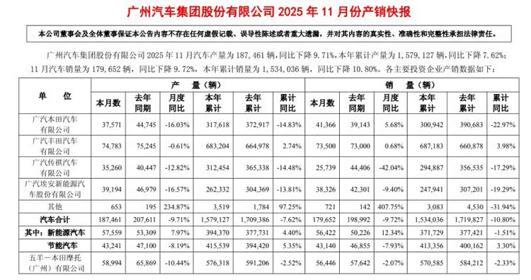 相关数据显示:今年前1-11月,广汽传祺销量29.4万辆,同比下滑17.29%;而埃安品牌零售销量25.16万辆,同比下滑20%;
