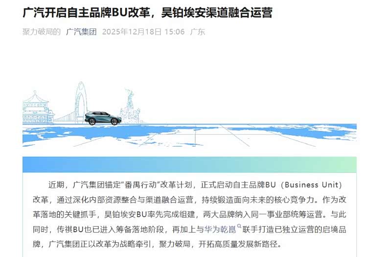 仅仅一年时间不到,昊铂品牌的独立运营之路就又迎来新的变数。12月18日下午,广汽集团宣布,启动自主品牌BU改革,称将通过深化内部资源整合与渠道融合运营,持续锻造面向未来的核心竞争力。而作为改革落地的关键抓手,昊铂埃安BU率先完成组建,两大品牌纳入同一事业部统筹运营。