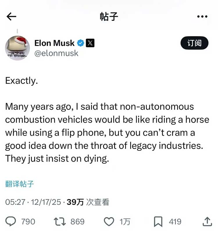 虽然话这么说,但马斯克可是丝毫不留情面的给福特判上了“死刑”。不仅点赞了网友认为福特电动化转型还停留在“减少排放”的表层理解上,还提到福特目前给电动化刹车就相当于“一边骑马一边使用翻盖手机”,还放狠话说福特这是在“坚持走向消亡”。