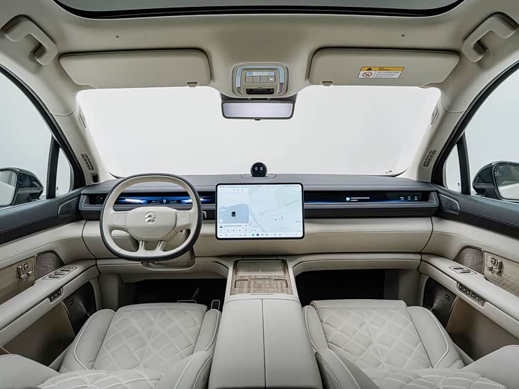 走进车内,环抱感座舱以横贯的Skyline天际屏为视觉中心,搭配15.6英寸3K中控屏与后排21.4英寸车顶屏,全车5块屏幕实现“前后排信息无缝联动”。高通骁龙8295P芯片加持下,车机系统响应迅速,支持六区域语音唤醒,“主驾导航、副驾听歌”互不干扰。