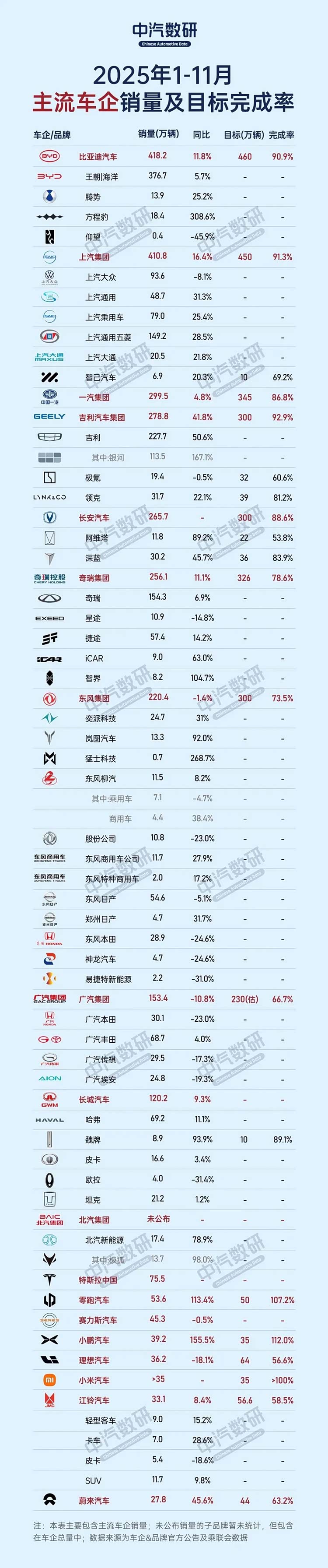 《车矩阵》行业分析:2025年即将收官之际,国内主流车企也到了“交卷”的时候,新能源车企“一哥”比亚迪在前11个月交出了418.2万辆的成绩,完成2025年度260万辆的90.9%,如果没有大的风险预计达成目标不成问题。