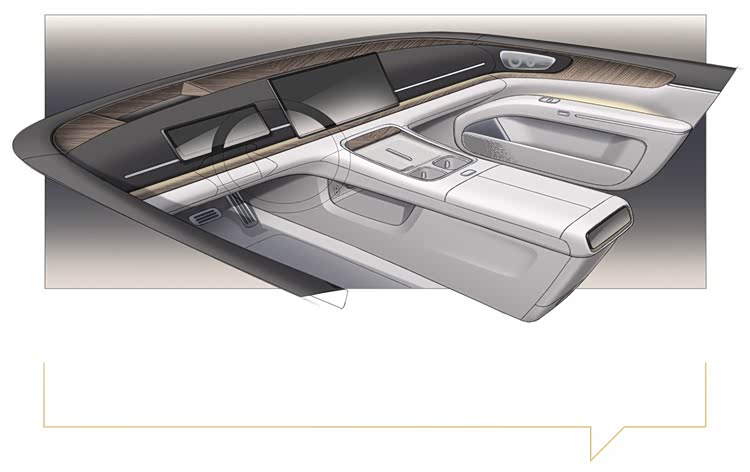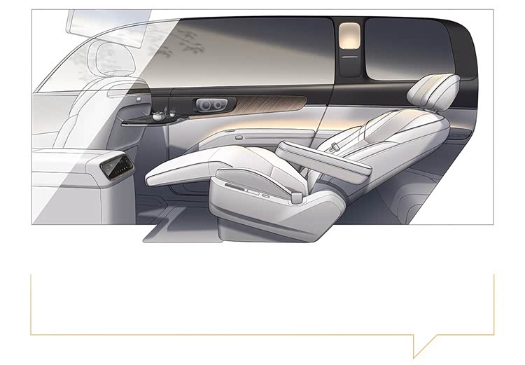 从设计图来看,新车的内饰比较简洁,提供有多功能方向盘、悬浮式全液晶仪表盘以及悬浮式中控屏,并没有提供副驾驶娱乐屏,操作台部分设计有无线充电面板,下方还有尺寸比较大的镂空储物槽,车载冰箱应该也没有缺席。