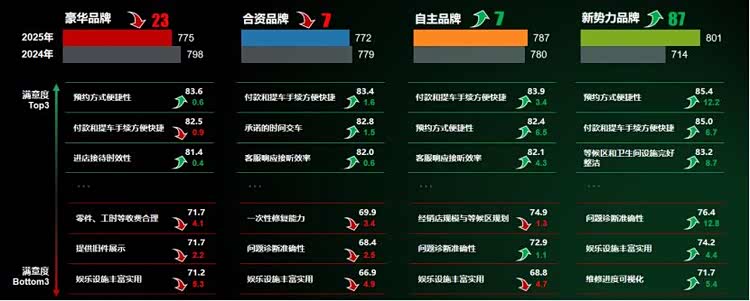 2025年12月18日,车质网与凯睿赛驰咨询联合发布《2025年中国乘用车售后服务满意度研究报告》,研究显示,2025年中国乘用车售后服务流程执行率提升至76.7%,售后服务满意度得分达到783分,均较2024年有所提升,行业整体服务水平呈现稳步上升态势。值得注意的是,“服务质量”在各维度满意度中仍处于最低水平,成为行业亟待突破的瓶颈。
