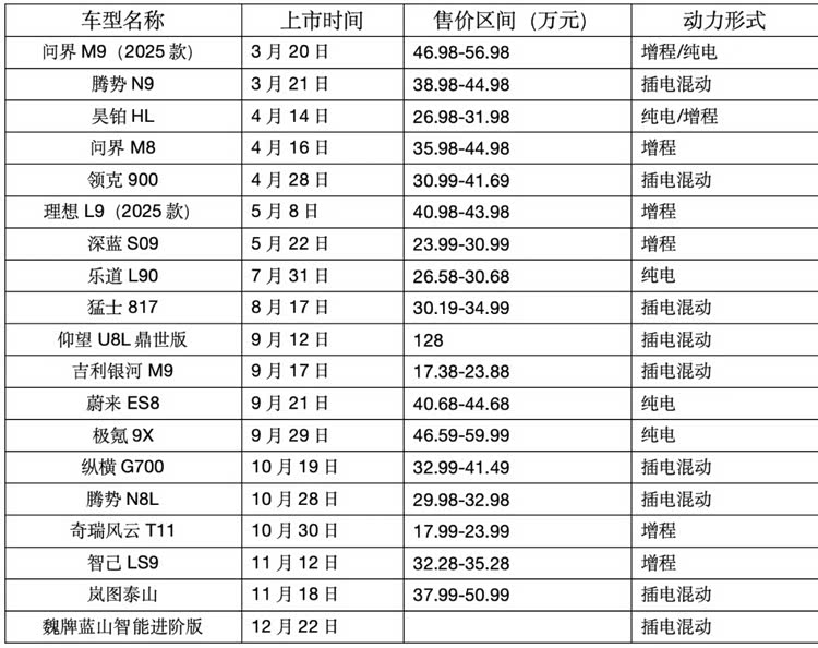 进入2025年,在理想L9、问界M9等成功车型的带动下,新能源大型SUV产品不断涌现,这些车型多为大六座,以增程或插混作为主要动力形式,可以列表大致概括以下19款: