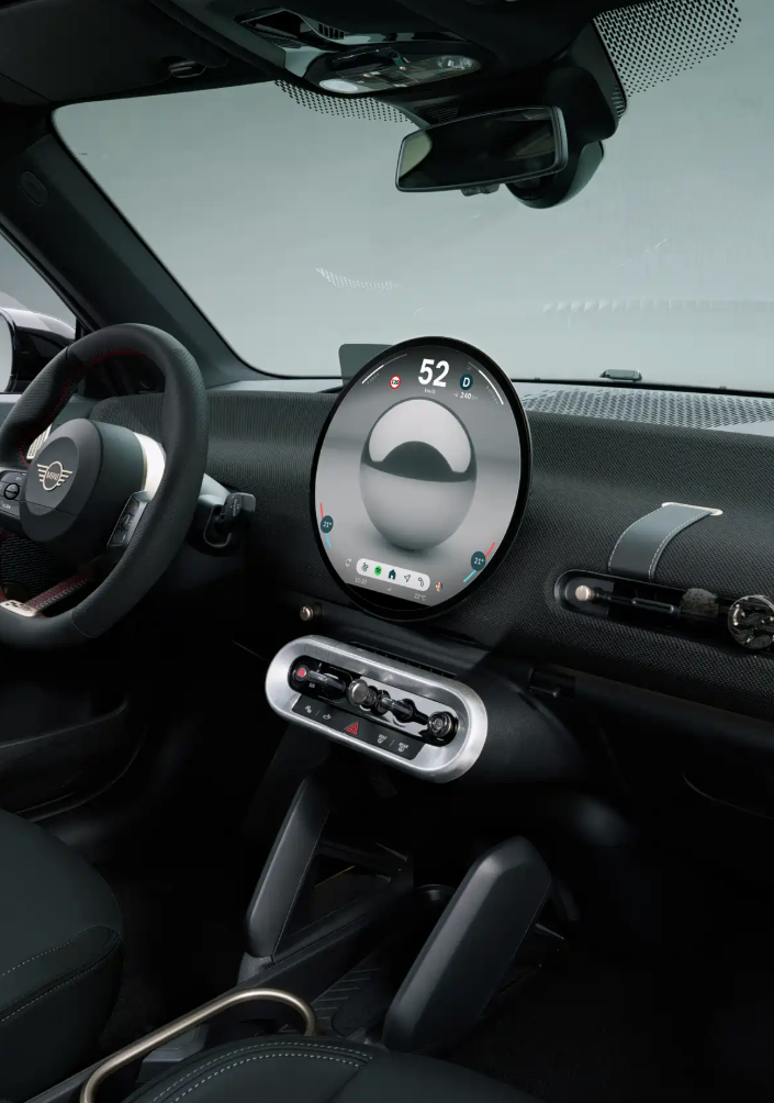 内饰设计则根据动力形式有所不同。燃油版车型采用了经典的红黑配色,搭配赛旗图案饰面,并配备了JCW同款运动座椅,强化运动氛围。电动版车型则首次采用了全黑内饰主题,座椅选用Vescin材质包裹,风格更为现代简约。