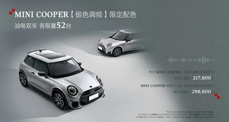 车家号·0浏览·2025-12-20 11:41 · 北京日前,MINI官方正式宣布,MINI COOPER银色调频限定版正式上市。新车同步提供纯电动与燃油三门版两种选择,其中电动版限时礼遇价为21.78万元起,燃油三门版为28.88万元起,两款车型均限量发售52台。