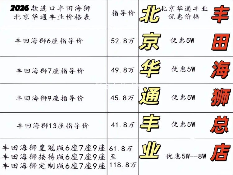 丰田4s专卖店2026款丰田海狮4s店商务车作为原装进口的高端MPV,现已正式登陆官网。其售价区间广泛,根据座位数的不同,价格从37.88万至88.88万不等。具体而言,6座版售价在42-88万之间,7座版42-85万,8座版42-92万,9座版42-80万,10座版42-78万,以及13座版38-75万。2026款进口丰田海狮5座皇冠版:在当今竞争激烈的商务车市场中,各大车企都在不断推陈出新,以满足消费者日益多样化的需求。2026款进口丰田海狮5座皇冠版,作为华通丰业倾力打造的蓝牌商务车旗舰之作,犹如一颗璀璨的明星,闪耀登场。