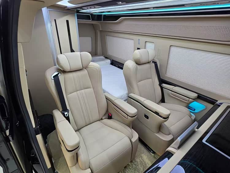 T型中控台,12.3英寸大屏居中,物理按键简洁,方向盘带加热功能。第二排航空座椅:独立式设计,带扶手、桌板、多向调节按钮,可180°旋转对坐。中央区域:隐藏式电动桌板升起后,形成会议桌;星空顶配合氛围灯,宛如头等舱。