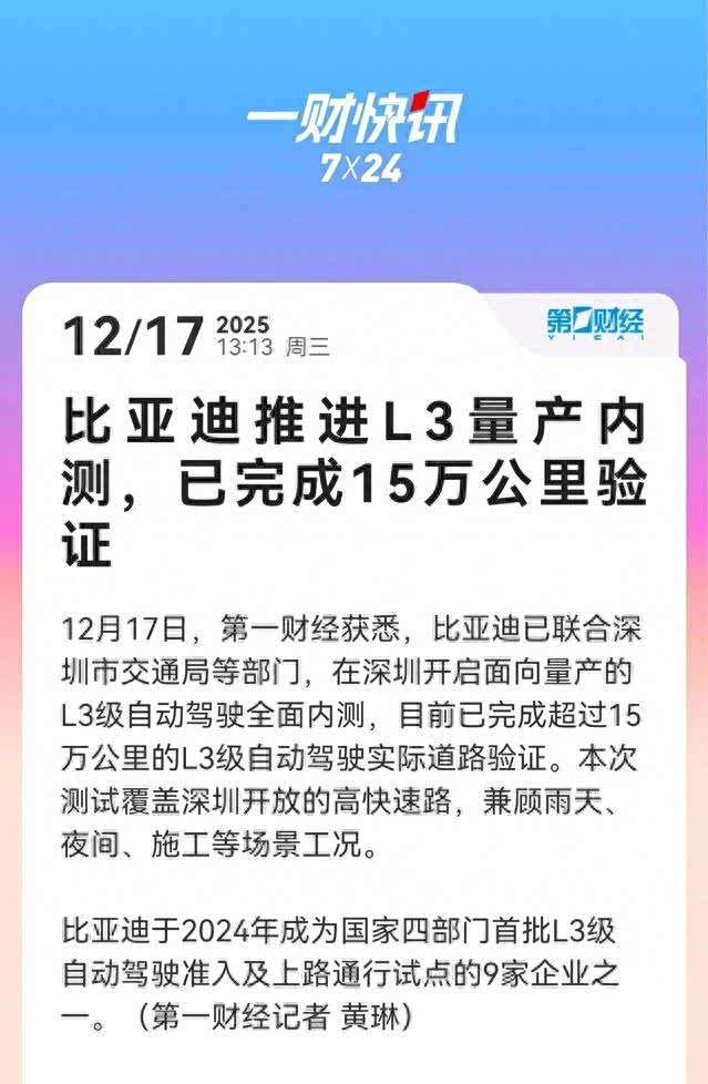 车家号·0浏览·2025-12-20 15:07 · 北京12 月 17 日,据第一财经获悉,比亚迪已联合深圳市交通局等相关部门,在深圳启动面向量产的 L3 级自动驾驶全面内测。截至目前,该项目已完成 超过 15 万公里的实际道路验证,测试覆盖深圳已开放的高快速路,并涵盖雨天、夜间、施工等多种复杂工况场景。