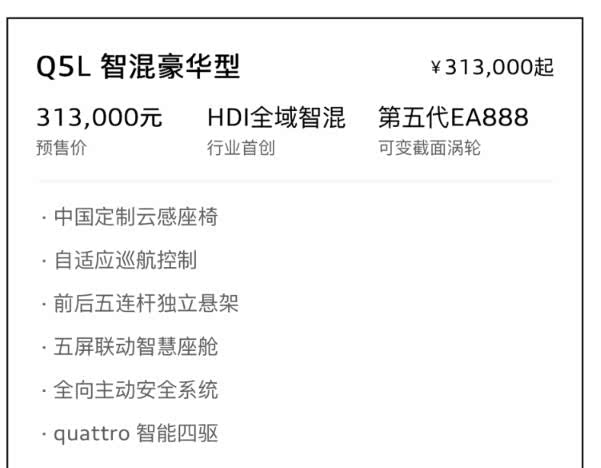 这不,全新奥迪Q5L来了,新车目前已经公布了预售价是31.3万起。如果按照预售价来算的话,即便是入门版落地价格也要在35万左右了。那么,在这种情况下,大家觉得全新奥迪Q5L还会是爆款吗?