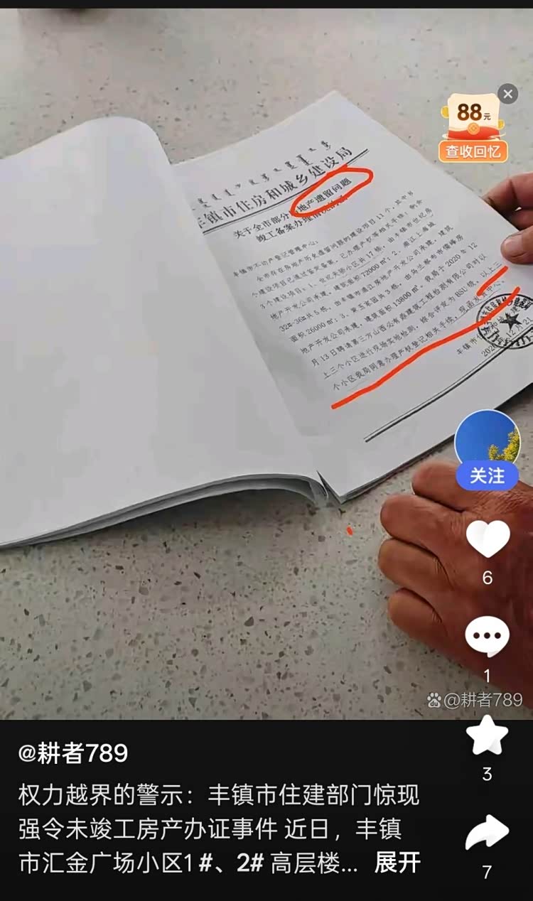 三、追问与呼吁:谁在为“违法办证”背书? 事件中最令人费解的是:丰镇市住建部门于2020年12月21日就已发函要求为汇金广场17栋楼“全部办理不动产证”,而彼时工程早已停滞多年。这封函件究竟是基于何种“政策依据”?是否经过集体决策?背后是否存在权钱交易或利益输送? 1. 必须彻查“权力越界”的深层原因 丰镇市住建部门副局长石*君(音)称“为了解决民生问题”,但“民生”的前提是“合法”与“安全”。若真为民生,为何不先解决承建方工程款问题?为何不督促开发商复工验收?为何在工地被占、设备被毁后仍默许“业主”入驻?这些反常行为背后,是否存在对开发商的“特殊关照”?是否存在滥用职权、收受贿赂的腐败问题? 2. 必须依法撤销违法登记,追究责任人 根据《不动产登记暂行条例》第二十九条,“不动产登记机构发现登记事项错误的,应当依法予以更正”。上级部门应立即责令丰镇市不动产登记中心撤销违规办理的不动产证,停止违法行政行为。同时,依据《中国共产党纪律处分条例》《公职人员政务处分法》,对住建部门相关责任人启动问责程序,彻查函件审批、决策过程中的失职渎职问题。 3. 必须守护法治底线:让权力在阳光下运行 法治社会的核心是“法律面前,权力止步”。丰镇市住建部门的教训警示我们:若监管者沦为规则的破坏者,市场将陷入混乱,民众将失去依靠。唯有以零容忍态度查处权力违法,才能重建政府公信力,让“法治”真正成为市场主体和人民群众的定心丸。