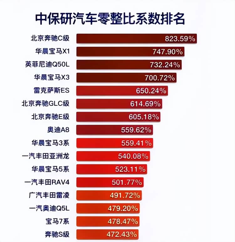 比如30万以上的车辆,零整比就没有一款车低于500%的,甚至超过600%的都有。也就是说,如果未来你的车要换什么部件的话,那就要掏难以想象的价钱钱来购买,没有的就只能眼睁睁看着车辆趴窝。
