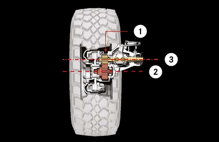 除了柔性车架,乌尼莫克还有独特的门式车桥,不仅用于提升离地间隙,轮毂处集成的轮毂减速齿轮,还承担着力矩分担作用,传动轴、差速器和半轴所承受的扭矩降低,提升系统耐久性。