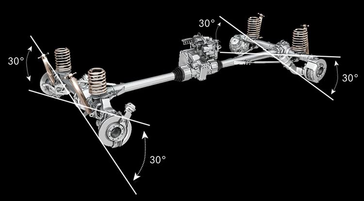 这种结构允许车桥整体实现30° 的摆动角,而传动系统仍保持稳定工作。这意味着,真正发生大幅度运动的是车桥,而不是车架本体。同时,封闭式扭矩管配合高位进气与密封通气系统,涉水深度可达1200 mm。