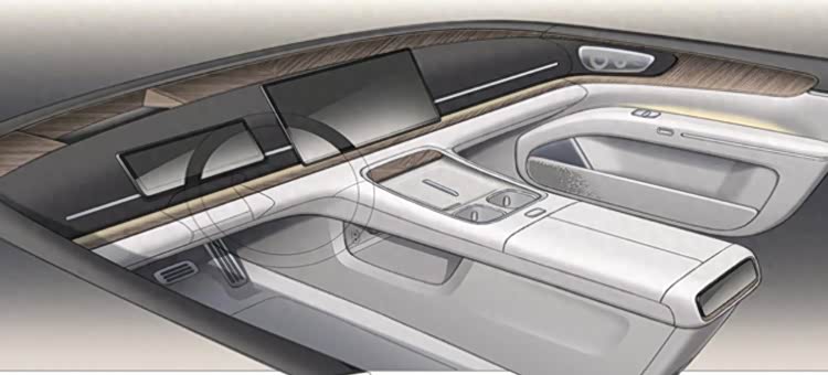 从目前曝光的设计图来看,其中控台使用了环抱式的布局风格,中控面板会带有木纹装饰,使用了悬浮式的仪表盘和中控大屏,中控台为立体式结构,上部带有杯架和手机无线充电板。
